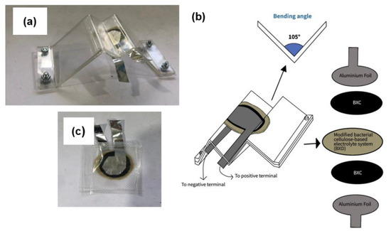 This zig-zag-shaped perspex plate is employed to test the supercapacitor’s performance with irregular shapes instead of flat shapes. This design enables the SCOBY-based supercapacitor to be useful in electronic applications that require irregular shapes, such as curved, wearable, miniaturized, portable, and flexible consumer electronics. Furthermore, the materials and methods are abundant, inexpensive, and straightforward. Therefore, large-scale production of this SCOBY-based supercapacitor is possible in the future. In this work, BC, NaBr, and MMT are used as the polymer host, ion provider, and filler, respectively. BC is also used in the electrodes as the polymer matrix with hydroxyl multiwalled CNT (MWCNT-OH) as the active material.