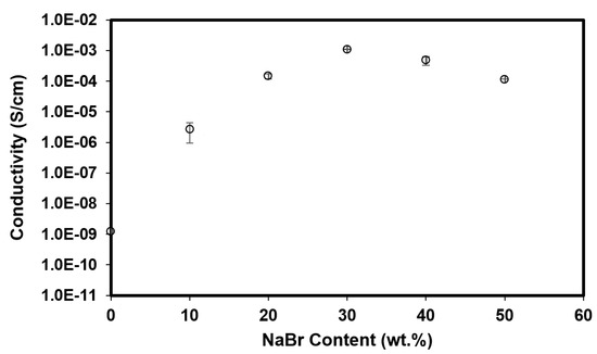 A polymer electrolyte must possess a high ionic conductivity just to be an efficient ion conductor in an EDLC. The conductivity must be at least ~10−3 S/cm. As shown in Figure 4, mixing BC and MMT produces a low conductive film with a conductivity of (1.24 ± 0.01) × 10−9 S/cm. This value lies between an insulator and a conductor. High conductivity is obtained with more amount of NaBr. As salt is added, instead of the cellulose matrix, the matrix is filled with Na+ and Br−, which will be beneficial for the adsorption or intercalation process in the energy devices [19].