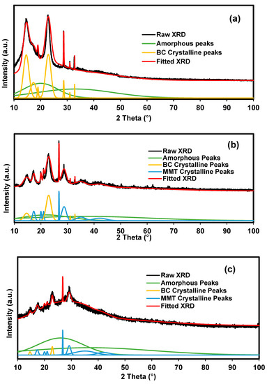 The deconvolution method was performed on the selected samples to verify the pattern of crystallinity as MMT and NaBr were added into BC polymer matrix. Figure 6 shows the deconvoluted XRD pattern of BC, BXD0%, and BXD30%. BC in Figure 6a shows several sharp and narrow crystalline peaks along with two broad amorphous peaks. This is a typical structure of semicrystalline materials. The χc is tabulated in Table 1. As MMT is added into BC polymer chain, the intensity of crystalline peaks of BC are observed to decrease and become smaller. Several crystalline peaks belong to MMT appeared in the deconvoluted XRD pattern of BXD0% (Figure 6b). The slight drop in degree of crystallinity can be seen in Table 1 as MMT is added. This signifies that the addition of MMT enhanced the amorphousness of BC film. In Figure 6c, the intensity of all crystalline peaks of MMT and BC decrease with the introduction of 30 wt.% NaBr, which indirectly reduces the χc and improves amorphousness of the film.
