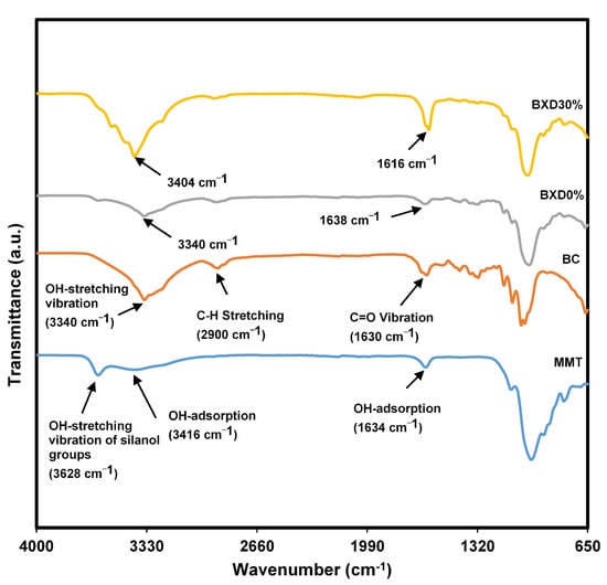 FTIR spectrum of MMT, BC, BXD0%, and BXD30%.