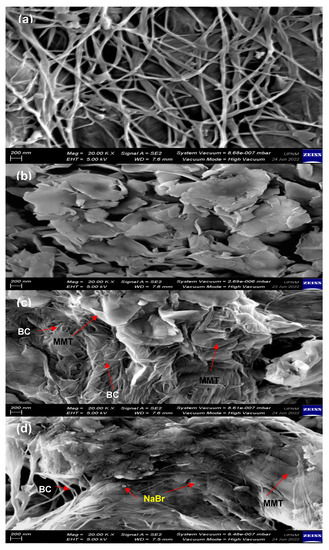 Figure 8b depicts the surface of MMT where it has a sheet structure along with large leaf-like crystals forming a dense aggregate. As MMT is added into BC matrix (Figure 8c), the diameter of BC fibers reduces to 34.76 from 57.95 nm. The gap between BC fibers is filled by MMT particles. Small MMT particles can penetrate into BC matrix, while large MMT particles accumulate at the surface of BC fiber. The existence of OH groups in both BC and MMT can lead to weak organic–inorganic hydrogen bonding interactions. This signifies the interaction between MMT and BC structures. Similar observations are obtained in other MMT-BC-based works [35]. In Figure 8d, particles from NaBr salt are embedded in the structure of BC-MMT matrix. The impregnation of NaBr further reduces the size of the BC fiber to 26.05 from 41.61 nm. Ions from the salts form dative bonds with oxygen containing functional groups in BC and MMT, causing the unraveling of the BC fibers network. The result is comparable with Zhou et al. [36], where a similar phenomenon was obtained as BC was doped with sodium alginate. The outcomes from FESEM analysis are consistent with the trend in XRD and FTIR analyses.