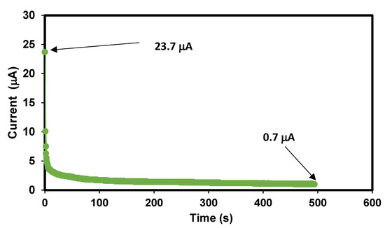 It is well known that in an EDLC, ions interact with the surface of carbon electrodes through electrostatic force. In this study, Na+ and Br− are the dominant charge-exporting species, and electrons are the less dominant charge exporter. It is crucial to verify the contribution of ions to the overall conductivity. This can be obtained by conducting polarization on the electrolyte with constant working voltage where the changes in current flow are being monitored simultaneously. The TNM plot of BXD30% is illustrated in Figure 9. A high current of 23.7 μA can be seen just when the process started. At this early stage, ions and electrons are driven toward the stainless steel electrodes, thus providing a high current value. In less than 10 s, a drastic drop in the current value can be observed. As soon as ions reach the surface of stainless steel, ions form electrostatic force with the electrodes.