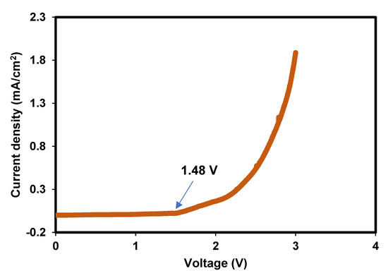 In this modern era, many technology or electrical appliances require a certain amount of voltage. Thus, it is essential to know the potential stability of an electrolyte before the EDLC fabrication process. Using a safe potential range can avoid the breakdown of the polymer chain during the long charging and discharging process. The goal is to identify at which potential the polymer electrolyte begins to oxidize or reduce and, thus, degrade. This is sometimes called breakdown potential [39]. The LSV plot of the highest conducting electrolyte is depicted in Figure 10. A stable current flow can be seen as the potential swept linearly from 0 to 1.48 V. Thus, it is safe to say that stable polarization and charge-double layer can be achieved in this potential region. The slope of the LSV plot is observed to increase more as the potential reaches 2.2 V. Beyond this limit, more degradation happens in the polymer matrix. This can reduce the performance of the EDLC.