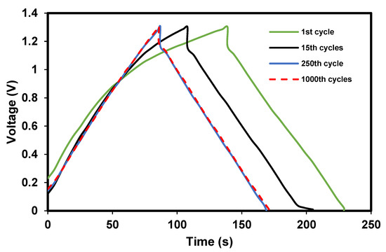 The full SCOBY-based EDLC is successfully fabricated where the charge–discharge curve of it is shown in Figure 11. The shape of the curves is a typical plot for an EDLC, where it almost looks to be a triangle shape. It is noticeable that there is a vertical and sudden voltage drop before the discharging process. This is due to the presence of internal resistance in the EDLC. Apart from that, the linearity of the discharge slope, indirectly, tells us that this EDLC has a capacitive behavior. Unlike EDLC, the pseudocapacitor or battery will have a nonlinear discharge curve. The shape of 1000th curve is more triangle than the 15th and 1st cycles. This is normal because a supercapacitor needs a certain cycle number before it reaches some stability.