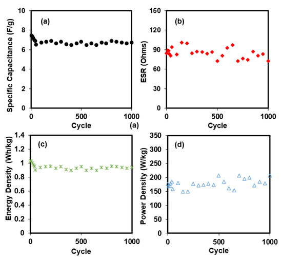 Figure 12b illustrates the ESR of the SCOBY-based EDLC obtained from 1000 charge–discharge cycles. ESR is an indicator of the internal resistance of the EDLC, which comes from the gap between the electrolyte and electrode themselves, current collector, external wires/clipper, and circuit. Electrode/electrolyte interaction also contributes to the ESR value. Another important parameter, which is responsible for the drop voltage, is the inclusion of PVDF to the EDLC electrode part, which is a good insulator. ESR for the first is 84.7 ohms. ESR of the EDLC seems to have fluctuated with the lowest and highest values at 72.7 and 100.5 ohm, respectively, where the pattern is less stable than the trend of Cs. Free ions tend to develop into ion triplets/pairs/aggregates at a fast charge–discharge rate and high cycle number. These types of formations require a high current to transfer charges and can block other free ions from reaching the surface of the electrodes [46,47].