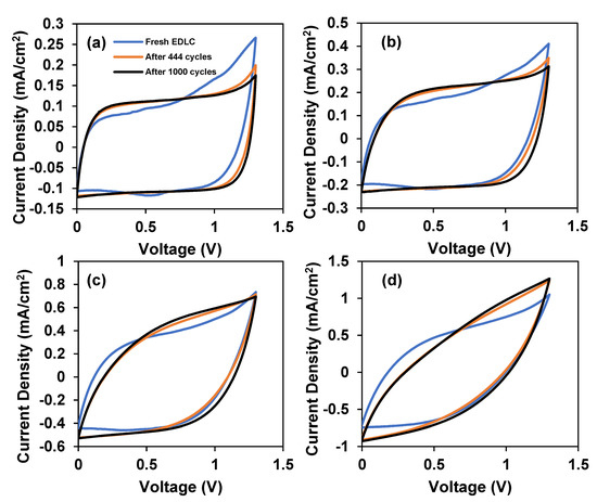 Cyclic voltammetry is another excellent tool to check capacitive behavior, electrochemical stability, and specific capacitance. CV analysis was performed for freshly fabricated EDLC after 444 charge–discharge cycles and after 1000 charge–discharge cycles in order to verify the pattern of the performance for charge–discharge. Figure 13 shows the CV plot of the EDLC at fast and slow scan rates. In all CV plots, it can be observed that fresh EDLC has a leaf-like shape CV plot. This tallies with the imperfect triangle-shaped charge–discharge curve for the first cycle in Figure 11. As the cycle number increased to 444 and 1000, the CV plot transformed into a rectangular-like shape. The rectangular-like shape CV plot indicates that the EDLC holds a good capacitive characteristic [48]. At initial cycles, most ions in the polymer matrix are in random distribution, thus, there is slower current response to voltage reversal at each end potential. This explains the tail on the top right part of the fresh EDLC CV plot. As the EDLC is charged and discharged for more cycles, proper charge-double layer is achieved leading to a rapid current response to voltage reversal, consequently altering the CV shape to a more rectangular shape.