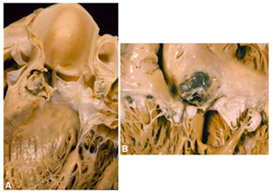 The local spreading of IE infection. IE originates from the aortic valve and can spread to the ventricular wall (A) and atrium wall (B). Adapted with permission from Thiene and Basso [16]. 2006, Elsevier.