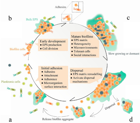 The molecular mechanisms of biofilm formation. Attachment (a), biofilm formation (b), maturation (c) and dispersion (d). Adapted from Jiang et al. [34]. The different colours and shapes model the different bacterial cells composing the biofilm.