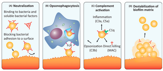 The antibodies against biofilm can disrupt ongoing biofilm formation and/or disperse established biofilms by different mechanisms: (A) neutralisation, (B) opsonophagocytosis, (C) complement activation and (D) destabilisation of biofilm matrix. Adapted with permission from Raafat et al. [42]. 2019, Elsevier.