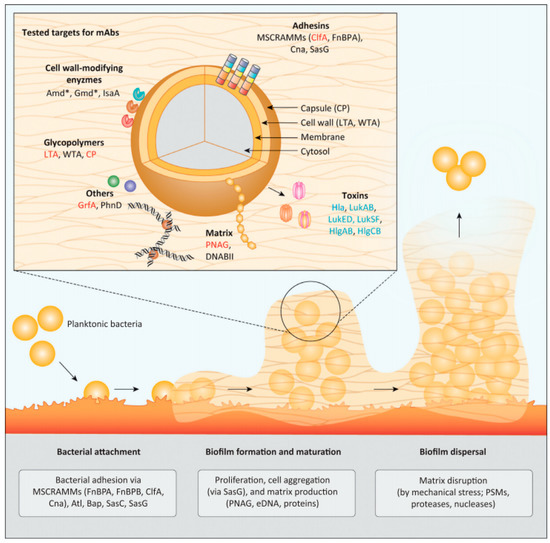 So far, the natural immunological reactions triggered by biofilm-associated infection are not well understood. Importantly, host antibodies stimulated by S. aureus antigens show reduced efficiency in preventing a reinfection with this pathogen [50]. As mentioned above, the process of biofilm formation can be summarised into three stages in which a wide range of functional proteins are involved. Given the importance of biofilm formation in the pathology of IE, current research on antibodies targeting S. aureus infections has included anti-biofilm strategies. So far, some bacterial proteins contributing to S. aureus biofilm formation have been considered as candidates for developing IE treatments, such as adhesins, biofilm matrix components, cell wall-modifying enzymes, surface glycopolymers and toxins (Figure 4).