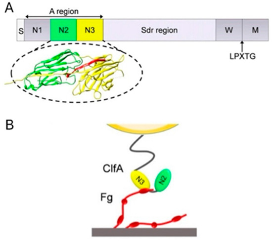 The protein structure of ClfA and its functional mechanism. (A) From the N- to C- terminus, ClfA is composed of signal sequence (S), A region with subdomains N1, N2 and N3, repeated serine-aspartate residues (Sdr) region, wall spanning (W) region, LPXTG motif (LPXTG) and sorting sequence (M). The binding site of Fg is between N2 (green) and N3 (yellow). (B) The γ-chain of Fg (red) binds to the trench between N2 and N3. Adapted from Herman-Bausier et al. [97].