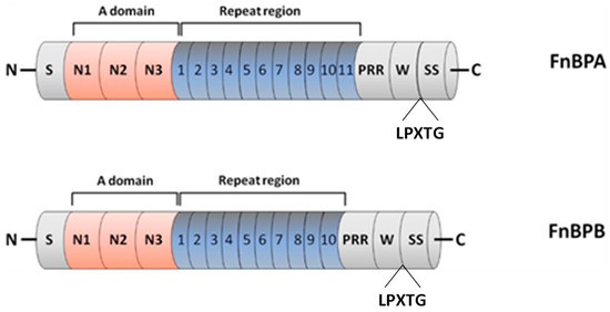 Domain organisation of FnBPA and FnBPB. From the N- to C- terminus, the FnBPs are composed of signal sequence (S), A domain with subdomains N1, N2 and N3, repeat region that is an unstructured region consisting of tandemly arranged motifs (11 in FnBPA and 10 in FnBPB), proline repeated region (PRR), wall-spanning (W) region, LPXTG motif (LPXTG) and sorting sequence (SS). Adapted with permission from O’Neill et al. [54]. 2008, American Society for Microbiology.