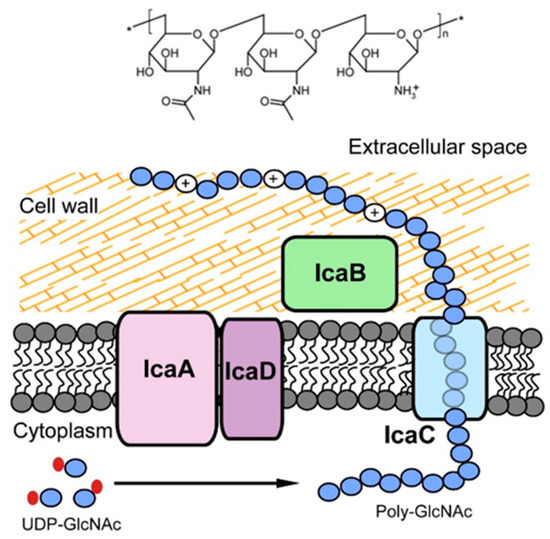 In the case of Gram-positive bacteria, the PNAG synthesis is mediated by the icaADBC locus consisting of four genes, which express four proteins assembling the intercellular adhesion system (Ica) including IcaA, IcaB, IcaC and IcaD (Figure 7). IcaA and IcaD exert primary roles in the exopolysaccharide synthesis. IcaA is a transmembrane enzyme with N-acetylglucosaminyl transferase activity, necessary for the synthesis of the PNAG polymer. However, the enzymatic activity of the product of the icaA gene becomes significant, and oligomers longer than 20 residues are synthesised only when co-expressed with the product of the icaD gene. IcaC translocates the PNAG polymer to the bacterial cell surface, and IcaB operates the deacetylation of the molecule.