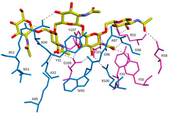 The overall interactions between F598 antigen-binding fragment (Fab)–GlcNAc and Fab–9NAc crystal structures. Fabs are depicted as thin sticks for the L (blue) and H (magenta) chains. Carbohydrate ligands are shown as thicker sticks with carbon atoms of GlcNAc in green and 9NAc in yellow. Adapted with permission from Soliman et al. [128]. 2014, IUCr.