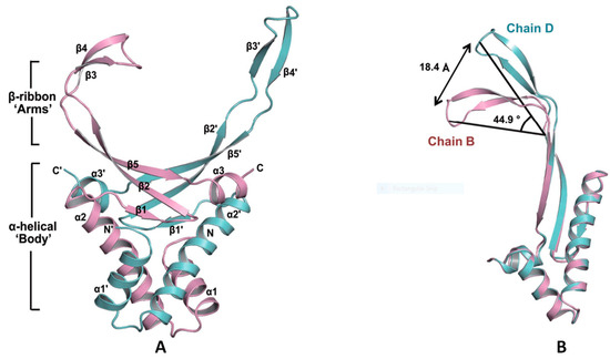 The structure and the DNA-binding mechanisms of SHU have been established (PDB ID: 4QJU). The high flexibility of β-arm is observed in the binding of DNA, and the residue Arg55 positioned in the hinge region of the β-arm exhibits a critical role in their flexible nature. The C atom of Arg55 from chain D is used as the vertex of the angle (Figure 9A,B) [139].