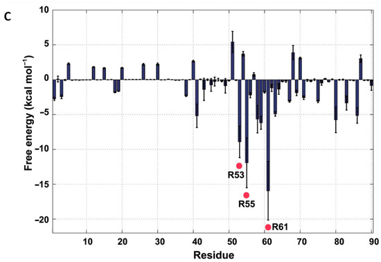 HU structure and the arginine residues involved in its DNA-binding site. (A) Ribbon diagram of the SHU homodimer. The α–helices, β–sheets and the N– and C–termini are labelled. The residue Arg55 is labelled in a circle. (B) The flexible β–ribbon arms deviate with a distance of 18.4 Å and with a bending angle of approximately 44.9°. (C) The binding free energies in the SHU–DNA complex, as determined by MD simulation. The three Arg residues (Arg53, Arg55 and Arg61) that show low free energies are marked with red points. Adapted from Kim et al. [139].