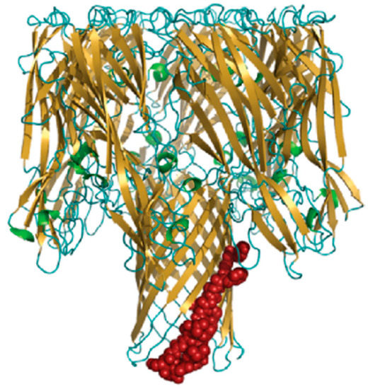 S. aureus AT is a molecule of ~33 kDa, which exerts its virulence upon a two-step-mediated mechanism. It first binds to its receptor (ADAM10) on the surface of host immune cells and endothelial cells. After that, AT molecules undergo a conformational change to promote oligomerisation, which in turn results in the formation of membrane pores, followed by cell lysis and tissue damage. The AT heptameric complex is comprised of two cylinders: a wider cylinder that comprises the cap and rim domains, and a narrow cylinder called the “pore-forming region” (Figure 10).