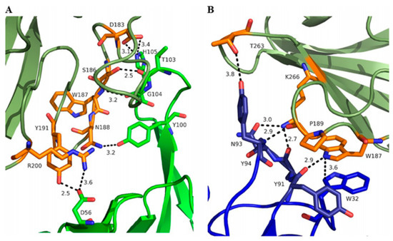 Interface between MEDI4893 HC (green) and AT (olive) (A) and MEDI4893 LC (blue) and AT (olive) (B). Both HC and LC are in close contact with the rim of AT and create several hydrogen bonds (dotted lines) and one stacking interaction between MEDI4893 Fab Trp32 (LC) and AT Trp187. AT residues in contact with MEDI4893 are shown in orange. Adapted from Oganesyan et al. [86].