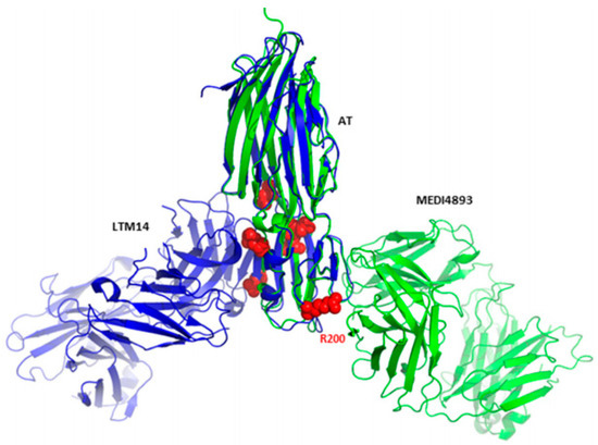 Superimposition of monomeric AT bound to MEDI4893 Fab (green) with monomeric AT bound to mAb LTM14 (PDB code 4IDJ, blue). Both Fab molecules bind to the same rim domain, though on opposite sides. Residues known to be critical for AT interaction with the cell surface receptor are shown as red spheres. Adapted from Oganesyan et al. [86].