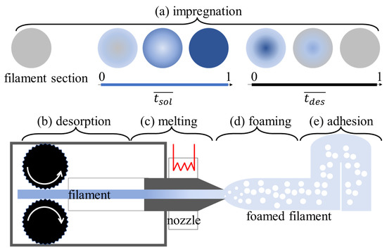 The process used for producing the microfoamed strands consists of the following steps: (1) solubilization of the blowing agent in the filament to be foamed, (2) diffusion of the blowing agent throughout the filament, (3) foaming at the exit of the printer nozzle, (4) stabilization, and (5) deposition of the foamed filament. Hence, the proposed technology can be schematized with the following units: (a) impregnation of the filament with the blowing agent, (b) desorption of the blowing agent, (c) melting, (d) foaming, and (e) adhesion of the strand (see Figure 1). Some more details on units a–d are given below.