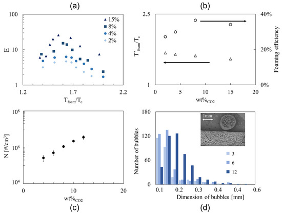 The trends of and of the foaming efficiency at as a function of the CO2 concentration are shown in Figure 1b. The optimal foaming temperature maximizing the expansion ratio decreases monotonically with the CO2 concentration (see the empty triangles in Figure 1b) because the plasticization effects enhance with the CO2 concentration [18]. The foaming efficiency reaches its maximum at 8 wt% of CO2, where the phenomena of the bubbles’ coalescence and gas escape are likely minimized (see the empty circles in Figure 1b). Our results are in good agreement with those by Mihai et al. [19], who found that in foam extrusion, a high concentration of CO2 enables the acquirement of closed-cell morphologies, taking advantage of the plasticization effect and the fast adiabatic expansion that stabilize the foamed structure.
