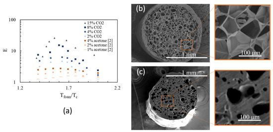 (a) Comparison between the expansion ratios achieved with CO2 (this work) and acetone [2]. SEM images of the cross section of a strand foamed with CO2 (b) and acetone (c).