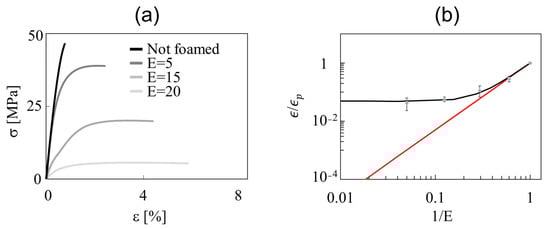 The foamed strands were characterized mechanically by means of microtensile tests over a range of expansion ratios from 1 to 20. The entire stress (σ)-strain () curves are shown in Figure 4a and the specific elastic modulus , where and are the elastic moduli of the foam and the “pure” polymer, respectively, is reported in Figure 4b as a function of 1/E. In Figure 4a, it is evident that as E increases, the elongation at the break of the strands increases and the elastic modulus (i.e., the initial slope of the stress–strain curve) decreases. The specific elastic modulus decreases in turn with an increasing E (decreasing 1/E) (see Figure 4b). A simple power-law model was proposed by Egli to describe such a dependency: . The exponent n was found to be close to two by many authors [24]. For our foamed strands at a high , where the power-law seems to hold, we found that the best fit of the experimental data yields n = 2.3 (see the red line in Figure 4b).