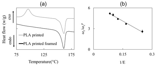 (a) DSC curves for a printed and foamed/printed PLA strand; (b) effect of expansion ratio on the crystallinity content—the dashed line is a guide for the eye.
