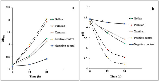 Many microorganisms prefer glucose as an energy source over other carbon sources [36]. Faria et al. [37] reported that XG contained 43% glucose, 32% mannose, and 24% glucuronic acid. GG consists of approximately 60% glucose, 20% glucuronic acid, and 20% rhamnose [38]. It was reported that the composition of monomers and linkage type influence fermentation time, with L rhamnose, arabinose, melezitose, and xylose being fermented slower than D-glucose [39]. This could explain why the microorganism grew slower on the media with the polysaccharides compared to pure glucose.