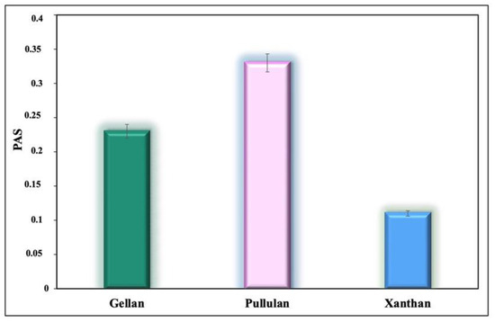 Prebiotic activity score (PAS) of the microbial polysaccharides. Significant difference (p < 0.05) was found with different polysaccharides.