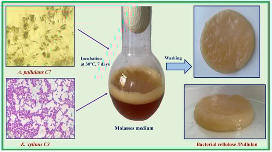 However, the use of artificially created microbial associations may be difficult due to competition for the limiting nutritional component of the medium. An example of this may be the attempt to cocultivate BC and PUL producers, carried out by Hu et al. [52]. It turned out that the yield of the BC/PUL composite (0.249 g/L) was lower than when PUL was directly added to the medium for K. xylinus (1.997 g/L). Both polymers are synthesized from glucose. Since the authors used glucose as the carbon source in the medium for the cocultivation of K. хylinus and A. pullulans, competition for this substrate could well have occurred. In this regard, we tested another medium, previously developed for these producers, where molasses served as a carbon source [53]. It is one of the most cost-effective sources of carbon in the microbiological area. Molasses is a by-product of the final crystallization step in the manufacturing of sugar. It is frequently utilized as a raw material for the preparation of nutritional media because of the substantial amount of sugar it contains. The scheme of the experiment is shown in Figure 3.