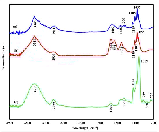 FTIR spectra of (a) BC/PUL, (b) BC, and (c) PUL.