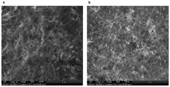 The BC and BC/PUL surfaces exhibit very different micromorphology. In the BC/PUL samples, there was a noticeable associated decrease in the spaces between the fibers (Figure 5b). Nevertheless, the porous structure of the film was generally preserved, displaying numerous macropores and mesopores ranging 20–1000 µm in diameter, as well as nanopores (up to 4 µm). The average measured pore size of the BC/PUL was 61 ± 5 μm, while for BC, it was 103 ± 6 μm, indicating that the PUL content had a significant impact on the pore size of the films. The decrease in the spaces between the fibers is consistent with the data of Gao et al. [56] and Liu et al. [64] on the modification of BC in situ by water-soluble polysaccharides. The average measured diameter of pure BC microfibrils was 63 ± 5 µm, and in the composite—80 ± 4 µm, i.e., they became thicker.