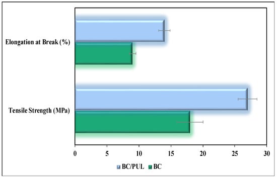 Tensile strength and elongation at break for BC and the BC/PUL composite. All differences were statistically significant (p < 0.05).