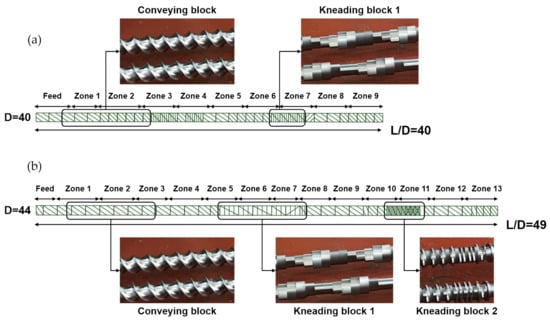 Two pilot-scale twin-screw extruders with different screw configurations were incorporated to realize peroxide-initiated reactions during PP extrusion through the sequential steps of conveying, melting, mixing, and homogeneous discharging. The twin screws present full intermeshing and co-rotating features but exhibit different shapes and configurations in terms of their elements. Detailed structural specifications of the twin screws are shown in Figure 1. The first twin-screw configuration (Figure 1a), with a screw diameter (D) of 40 mm and an aspect ratio of L/D = 40 (L is the screw length), includes normal conveying and kneading blocks, which is used for general polymer production purposes (at relatively low shear conditions). The conveying block plays a main role in transporting a polymer melt through weak or mild mixing. The kneading block is used to distribute and disperse a polymer resin by mixing it rather strongly. The second twin-screw (Figure 1b), with D of 44 mm and L/D = 49, which is specifically used for glass-fiber compounding (at relatively high shear conditions), comprises additional harsh kneading blocks for intense distributive mixing. Kneading block 2, which has a shorter pitch compared to kneading block 1, provides stronger distribution and dispersion. To distinguish the two twin-screw configurations with different L/D values, screw diameters, and kneading blocks, the former was named “mild” and the latter “harsh”.