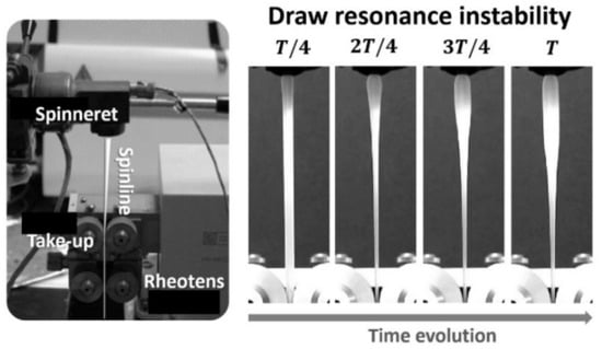The applicability of peroxide-treated CR-PP (with 200 ppm peroxide) to the fiber-spinning process (Figure 2), which is one of representative extensional deformation processes, was confirmed via a comparison with commercial homo PPs (HK100, FR160, and HP653P) as staple fiber products. The melt tensions of PPs in the spinline from the die nozzle to the take-up (25 cm) were measured using a Rheotens (GÖTTFERT, Buchen, Germany) and a single-screw extruder (Collin, Maitenbeth, Germany, D = 30 mm and L/D = 25) under several extrusion rate conditions, i.e., 0.25, 0.5, and 0.75 kg/h at an extrusion temperature of 180 °C. Melt tension measured by gradually increasing take-up speed, which is an important extensional rheological property, is associated with the flow instability in the spinline [36]. One representative flow instability is draw resonance (Figure 2), which is characterized by periodic oscillations of the spinline diameter or the spinline tension over a certain drawdown ratio (i.e., the take-up velocity divided by the inlet velocity at the spinneret or nozzle). The onset of draw resonance instability for the PPs was determined using the drawdown ratio [37,38].