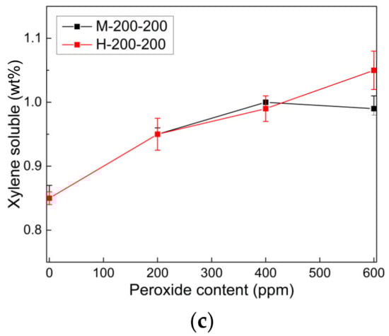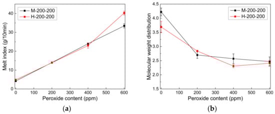 Figure 3a shows the effect of peroxide content on the MI of PPs. The MI tends to increase linearly with the peroxide content, implying that the molecular weight of PP is reduced owing to the more extensive chain scission reaction during the reactive extrusion process. The MI data obtained using mild and harsh screw extruders differed significantly in the CR-PP containing more than 400 ppm of peroxide. In particular, the harsh screws that exerted a higher shear force and a longer residence time inside the extruder resulted in a higher MI.