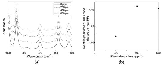 (a) FT-IR spectra for CR-PPs with different peroxide contents in the range of 1000 to 800 cm−1 wavenumber. (b) Peak area of C = C bonds for CR-PPs relative to that of neat PP.
