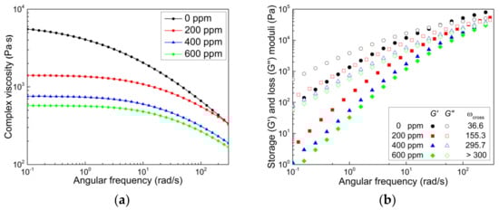 The melt rheological properties of neat PP (HD500) and its CR-PPs treated with different amounts of peroxide, i.e., their complex viscosity as well as storage and loss moduli data, were measured at 200 °C (Figure 5). Samples were prepared using a mild twin-screw extruder under the same extrusion conditions as shown in Figure 3. As the amount of peroxide increased, the complex viscosity of PPs decreased, as expected, and the Newtonian regime in the low-intermediate frequency range expanded (Figure 5a). Notably, the addition of a small amount of peroxide (200 ppm) considerably reduced the viscosity level, thereby alleviating non-Newtonian shear thinning. Regarding the viscoelastic modulus data shown in Figure 5b, both the elastic (G’) and viscous (G’’) moduli decreased, and the crossover frequency (ωcross) at the intersection of G’ and G’’ increased with the peroxide content, implying weakened viscoelastic features owing to extensive chain scission. The change in the crossover point directly indicates structural changes in PP, such as the molecular weight and MWD. The higher the peroxide content, the higher the frequency and modulus at the crossover point, supporting that peroxide effectively reduces the molecular weight and narrows the MWD of PP, as shown in Figure 3b and Figure 5a.