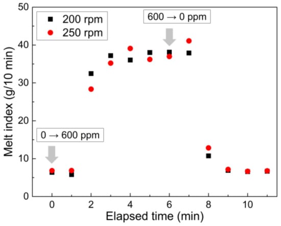 During the continuous pilot-scale reactive extrusion of PP, residues inside the extruder can affect subsequent products containing different peroxide contents. When the peroxide content for CR-PP production was changed stepwise from 0 to 600 ppm (and from 600 ppm to 0) in the hopper during the continuous harsh twin-screw extrusion under 200 and 250 rpm conditions and a temperature of 215 °C, the MI of the CR-PP extrudates changed gradually during the transit period, based on the residence time of melt polymers traveling between twin-screws inside the extruder (Figure 6). After changing the peroxide content in the hopper to 600 ppm, 1 min was required to fully apply peroxide to the extruder. Thereafter, the MI increased during the residence time of approximately 3 min, and conversely, changing the peroxide content to 0 ppm decreased the MI up to an elapsed time of 3 min, as in the previous case. Note that screw speed did not significantly alter the MI of the PP extrudates.