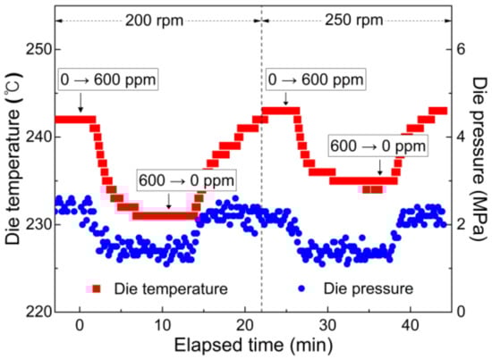 Variation in temperature and pressure at die position after step changes of peroxide content in input polymer materials (0 600 ppm and 600 0 ppm) under extrusion conditions of 215 °C as well as 200 and 250 rpm.