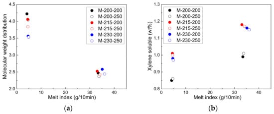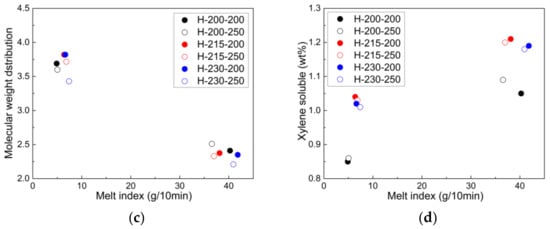 Relationship of (a,c) molecular weight distribution and (b,d) xylene-soluble property with respect to melt index of CR-PPs under various extrusion conditions.