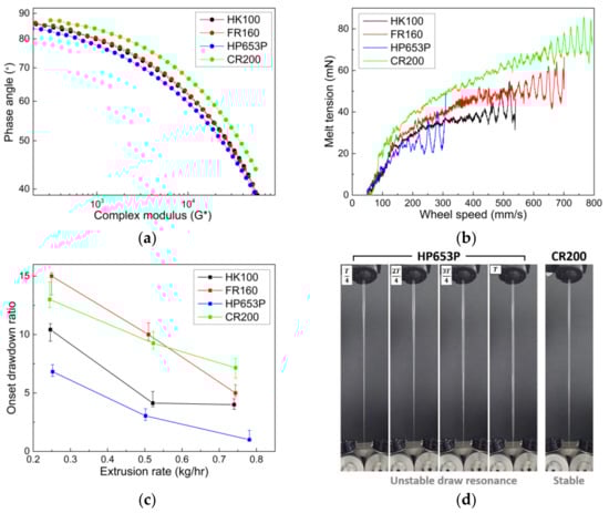 Comparison of (a) van Gurp–Palmen plot, (b) melt tension, and (c) draw resonance onset of CR-PP (CR200) and homo PPs (HK100, FR160, and HP653P) in melt-spinning process. (d) Fiber formations from the spinneret to take-up for HP653P (unstable state) and CR200 (stable state) under conditions of drawdown ratio of 8 and extrusion rate of 0.5 kg/h. T is the period of oscillation.