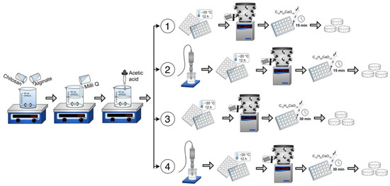 Sodium alginate (Sigma Aldrich, Mannheim, Germany, # 9005-38-3) and chitosan (medium molecular weight, Sigma Aldrich, Mannheim, Germany, # 448877) (0.75–1.25% w/v) powders were mixed and dissolved in ultrapure water (Milli-Q system, 18.2 M-cm) and acetic acid (1% w/v, Sigma Aldrich, Mannheim, Germany, #1005706). The pH was adjusted to be between 5 and 6 to favor the interaction between the biomaterials. The resulting mixture/solution was ready for undergoing the corresponding experimental method (1 to 4), see Figure 1. In all cases, the scaffold solutions placed within the 24-well box were frozen at −20 °C for 12 h and subsequently freeze-dried in a lyophilizer (Labconco Corporation, Kansas City, MO, USA) for 8 h at −49 °C under vacuum with a pressure of 0.100 mBar.