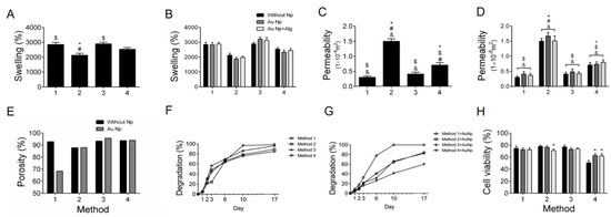(A) Swelling percentages (%) for the four scaffold preparation methods. (B) Swelling percentages for the four preparation methods functionalized with AuNp and AuNp+Alg. (C) Permeability (m2) for the four scaffold preparation methods. (D) Permeability for the four preparation methods functionalized with AuNp and AuNp+Alg. (*) p < 0.001 vs. Method 1, ($) p < 0.001 vs. Method 2, (#) p < 0.001 vs. Method 3, (&) p < 0.001 vs. Method 4. (E) Porosity percentage (%) for the four scaffold preparation methods and the scaffolds functionalized with AuNp. (F) Degradation degree for the four scaffold preparation methods and (G) the functionalization of the four methods with AuNp. (H) Graphical representation of cell viability analysis for the four preparation methods functionalized with AuNp and AuNp+Alg. (*) p < 0.001 vs. without Np. Data are presented as the mean ± SE.