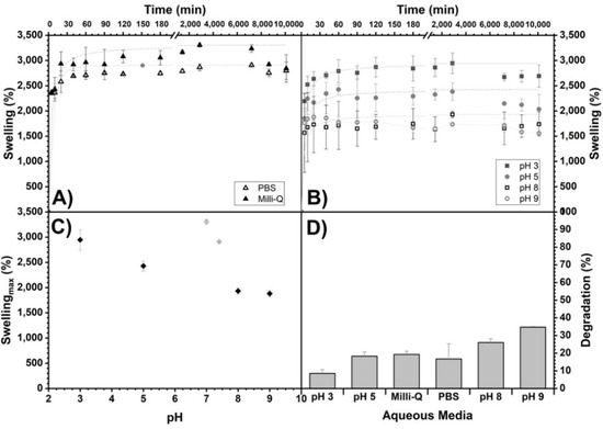 Swelling of alginate/chitosan scaffolds (Method 3) as a function of time in different aqueous media: (A) Milli-Q and PBS and (B) buffers prepared with Na2HPO4/citric acid for pH 3, 5, 8 and 9. In addition, their maximum swelling (Smax) as a function of pH (C) and the percentages reached with respect to Smax at 5, 40 and 60 min are shown (see Table 1). Maximum swelling trend lines are shown as an eye guide. (D) Percentage of degradation (%) of the scaffolds of Method 3 (more crosslinking time) as a function of the aqueous medium exposed for 7 days.