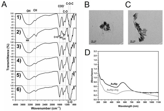 (A) FTIR-ATR spectra of: sodium alginate (1), chitosan (2) and alginate/chitosan scaffolds before (3) and after crosslinking (4, Method 3) and with incorporation of gold (5) or gold plus sodium alginate (6) nanoparticles. Vertical dotted and continuous lines are presented as eye guides. Representative electromicrographs of (B) AuNp and (C) AuNp+Alg obtained by TEM. (D) Gold nanoparticles plasmon.