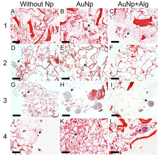 Representative photomicrographs of cross sections of the constructs. Method 1: (A) without Np, (B) AuNp and (C) AuNp+Alg. Method 2: (D) without Np, (E) AuNp, and (F) AuNp+Alg. Method 3: (G) without Np, (H) AuNp and (I) AuNp+Alg. Method 4: (J) without Np, (K) AuNp and (L) AuNp+Alg. H&E. Identifier: arrow (spheroids). Scale bar: 200 µm, original magnification: ×100.