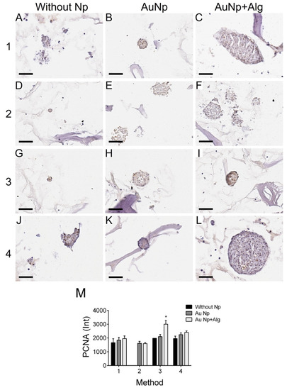 Representative photomicrographs of PCNA expression in different constructs. Method 1: (A) without Np, (B) AuNp and (C) AuNp+Alg. Method 2: (D) without Np, (E) AuNp and (F) AuNp+Alg. Method 3: (G) without Np, (H) AuNp and (I) AuNp+Alg. Method 4: (J) without Np, (K) AuNp and (L) AuNp+Alg. Scale bar: 50 µm, original magnification: ×400. (M) Graphical representation of the quantitative analysis of PCNA expression (Int) in the different constructs. (*) p < 0.001. Data are presented as the mean ± SE.