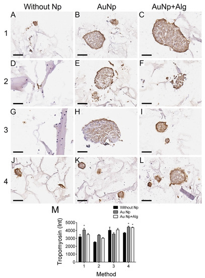 Representative photomicrographs of tropomyosin expression in different constructs. Method 1: (A) without Np, (B) AuNp and (C) AuNp+Alg. Method 2: (D) without Np, (E) AuNp and (F) AuNp+Alg. Method 3: (G) without Np, (H) AuNp and (I) AuNp+Alg. Method 4: (J) without Np, (K) AuNp and (L) AuNp+Alg. Scale bar: 50 µm, original magnification: ×400. (M) Graphical representation of the quantitative analysis of tropomyosin expression (Int) in the different constructs. (*) p < 0.001. Data are presented as the mean ± SE.